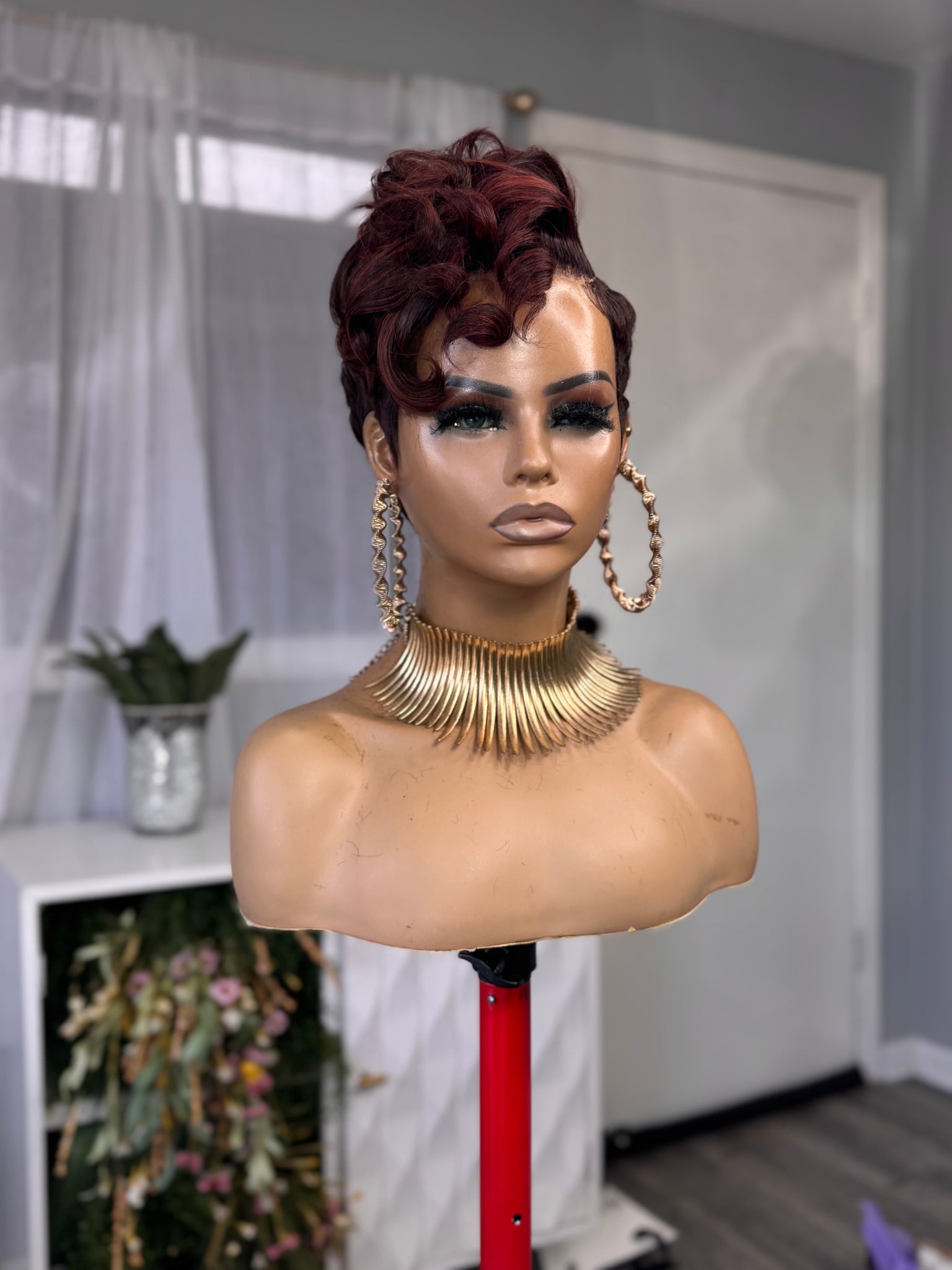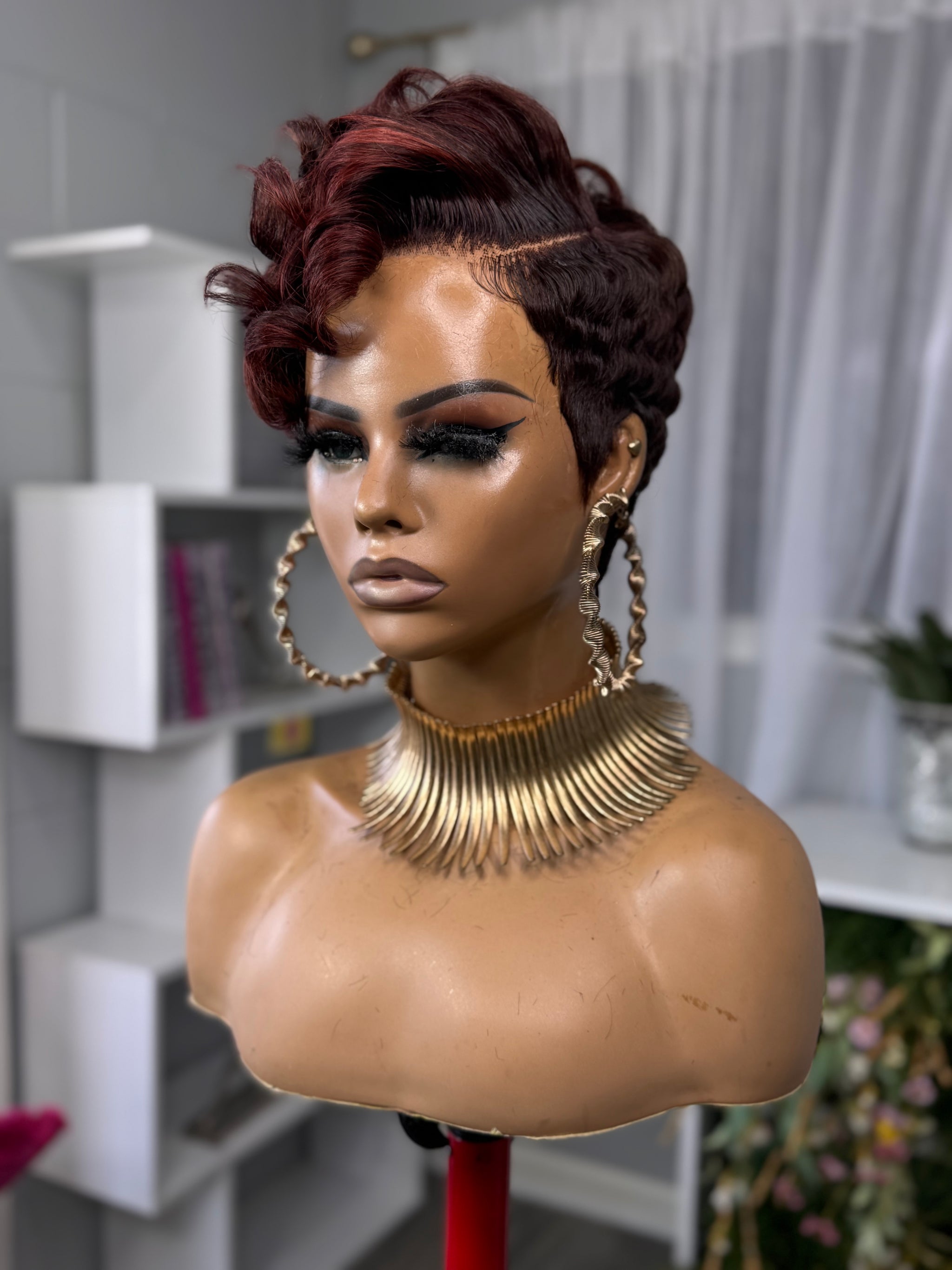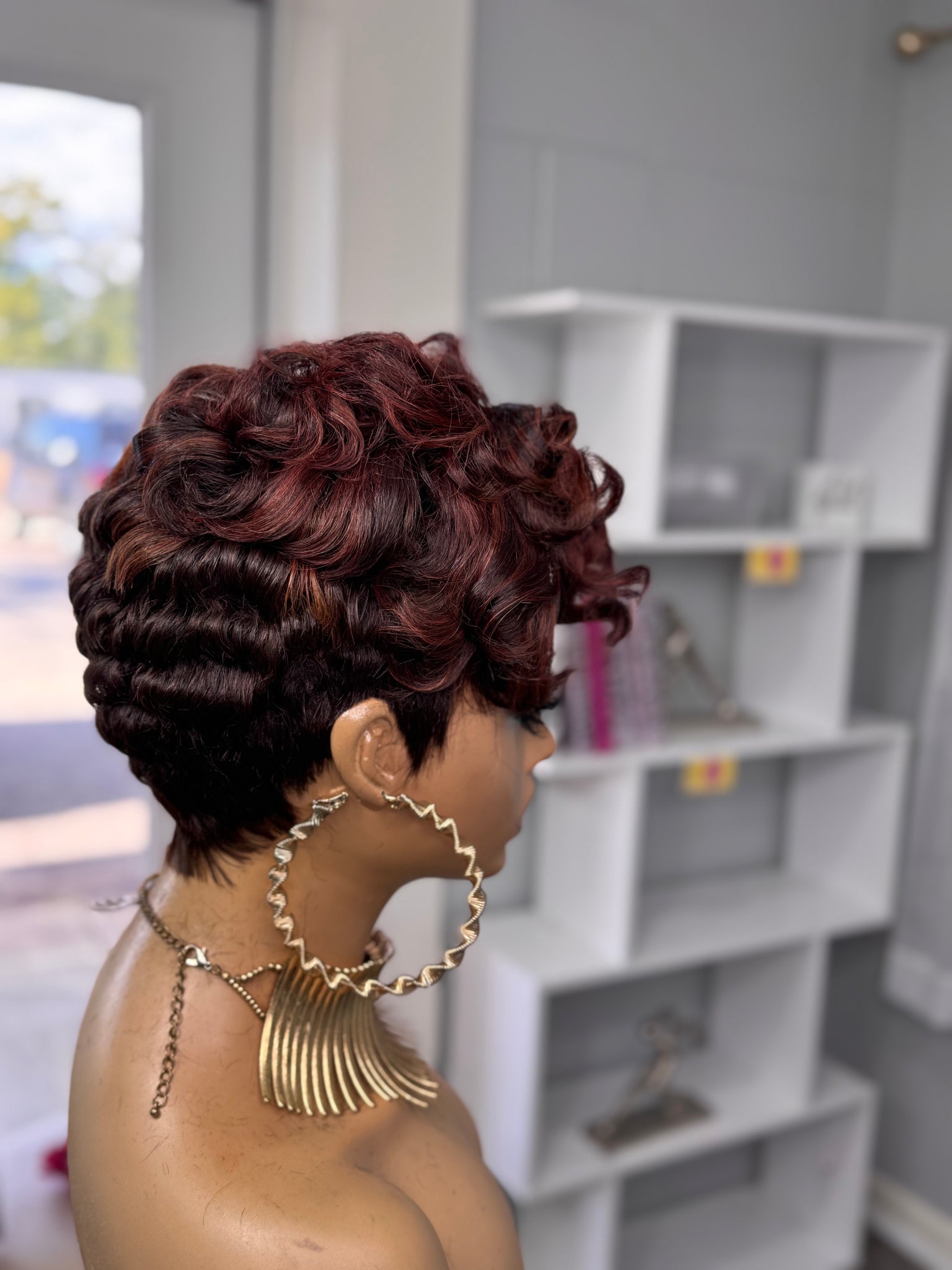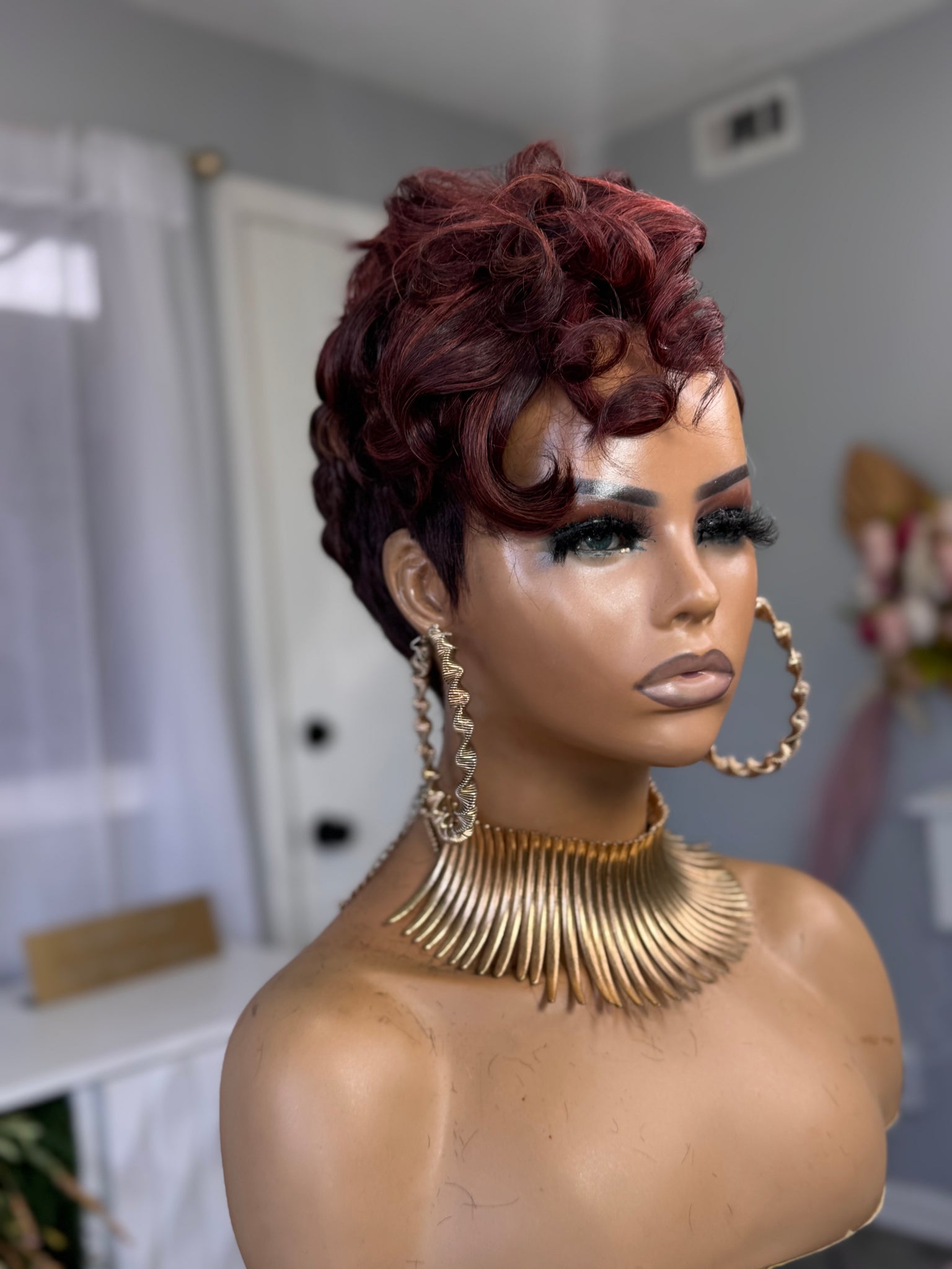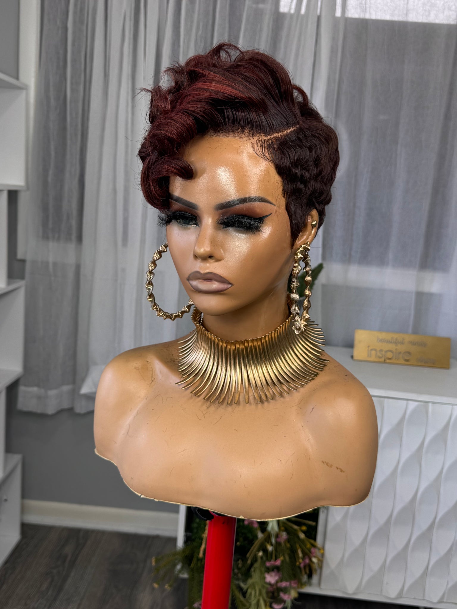 The double-processed copper and arboran tones melt together beautifully, creating a warm, dimensional color that glows under any light. This pixie is cut to perfection .