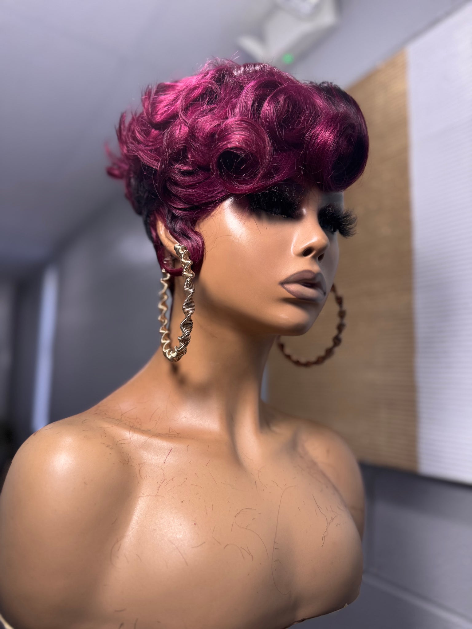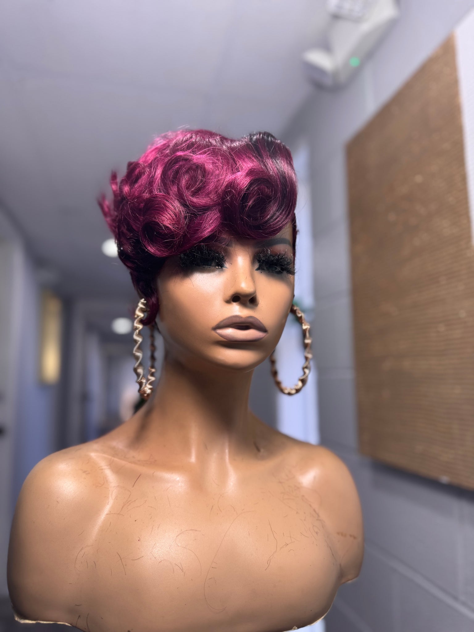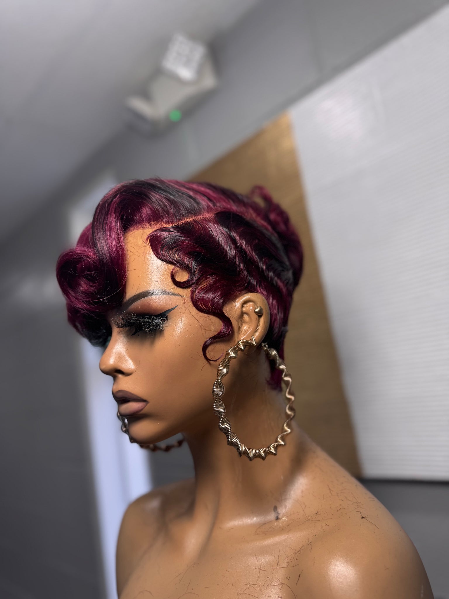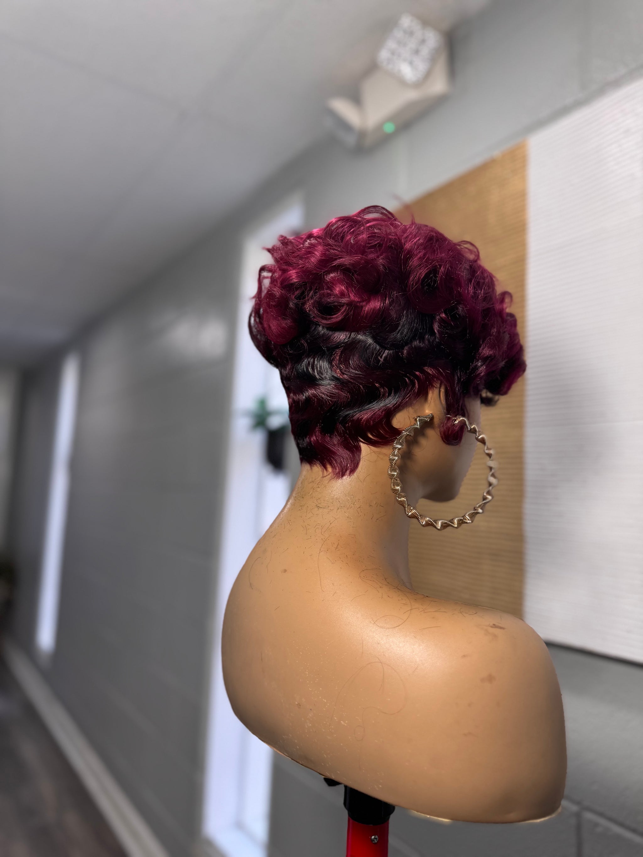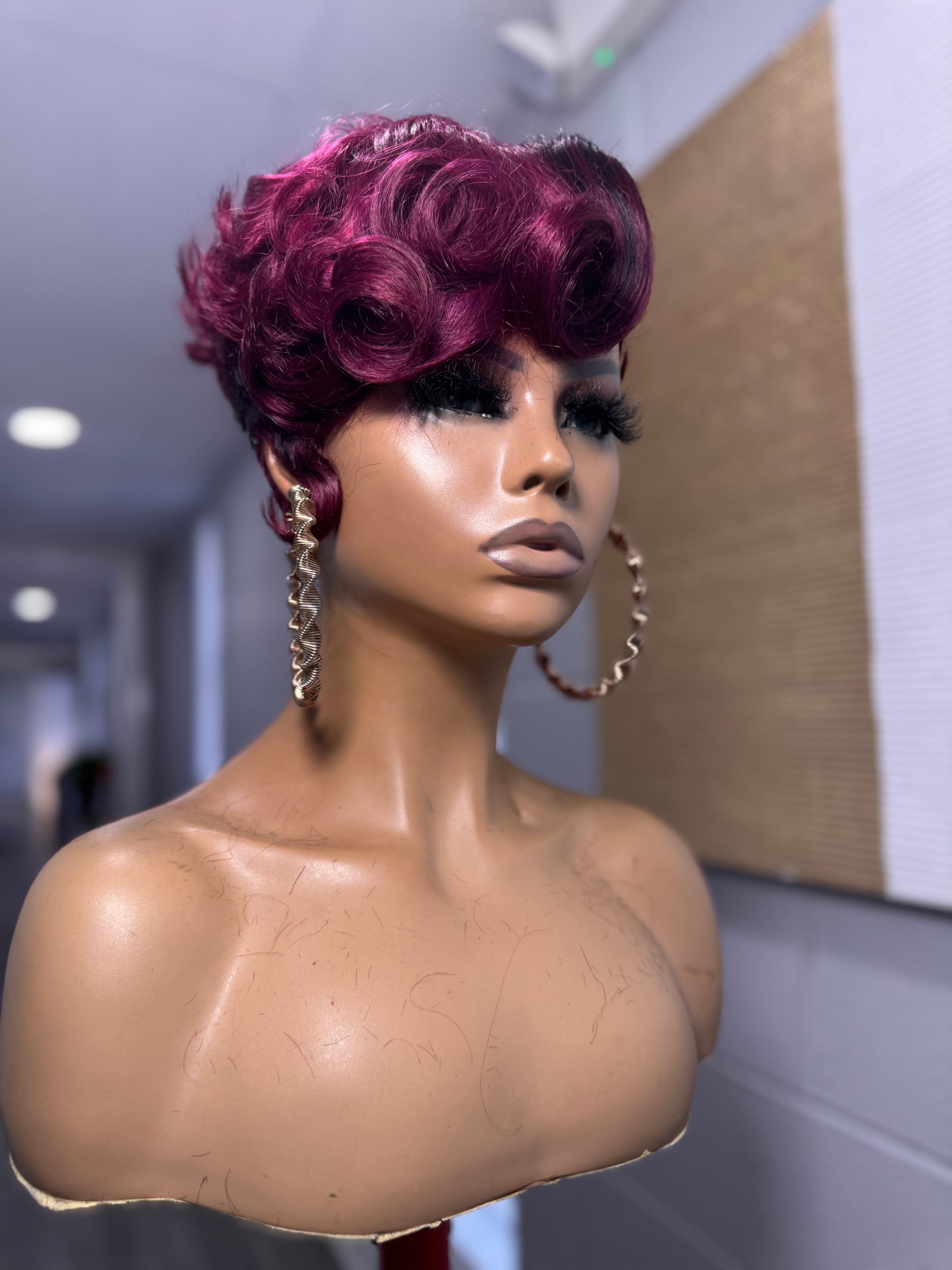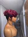 She is a full lace glueless unit on a small cap with different hues of burgundy mixed with rich black lowlights. The perimeter has soft finger waves for that vintage meets high fashion look and the top has a soft voluminous flat ironed finish that gives it a clean edgy shape.