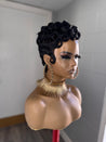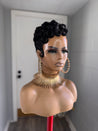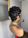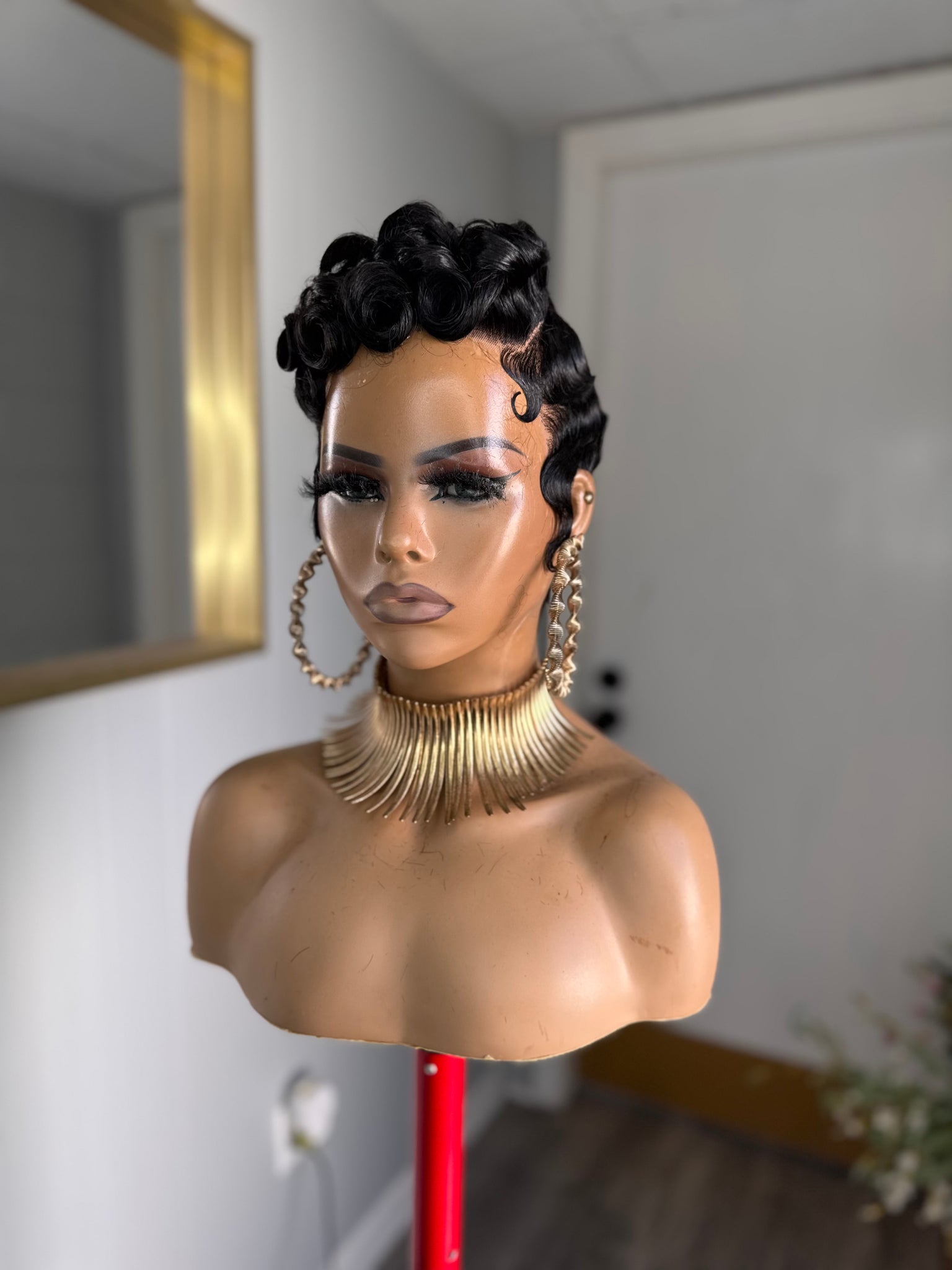 Chica is a jet black, full lace pixie made with a Spanish curl texture, styled into a molded heat-set pin curl look with soft finger wave definition. Because the base texture is naturally wavy, she gives you a two-in-one style. Enjoy her molded set, and when the style loosens, simply spray water and let her natural waves come back.