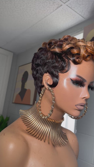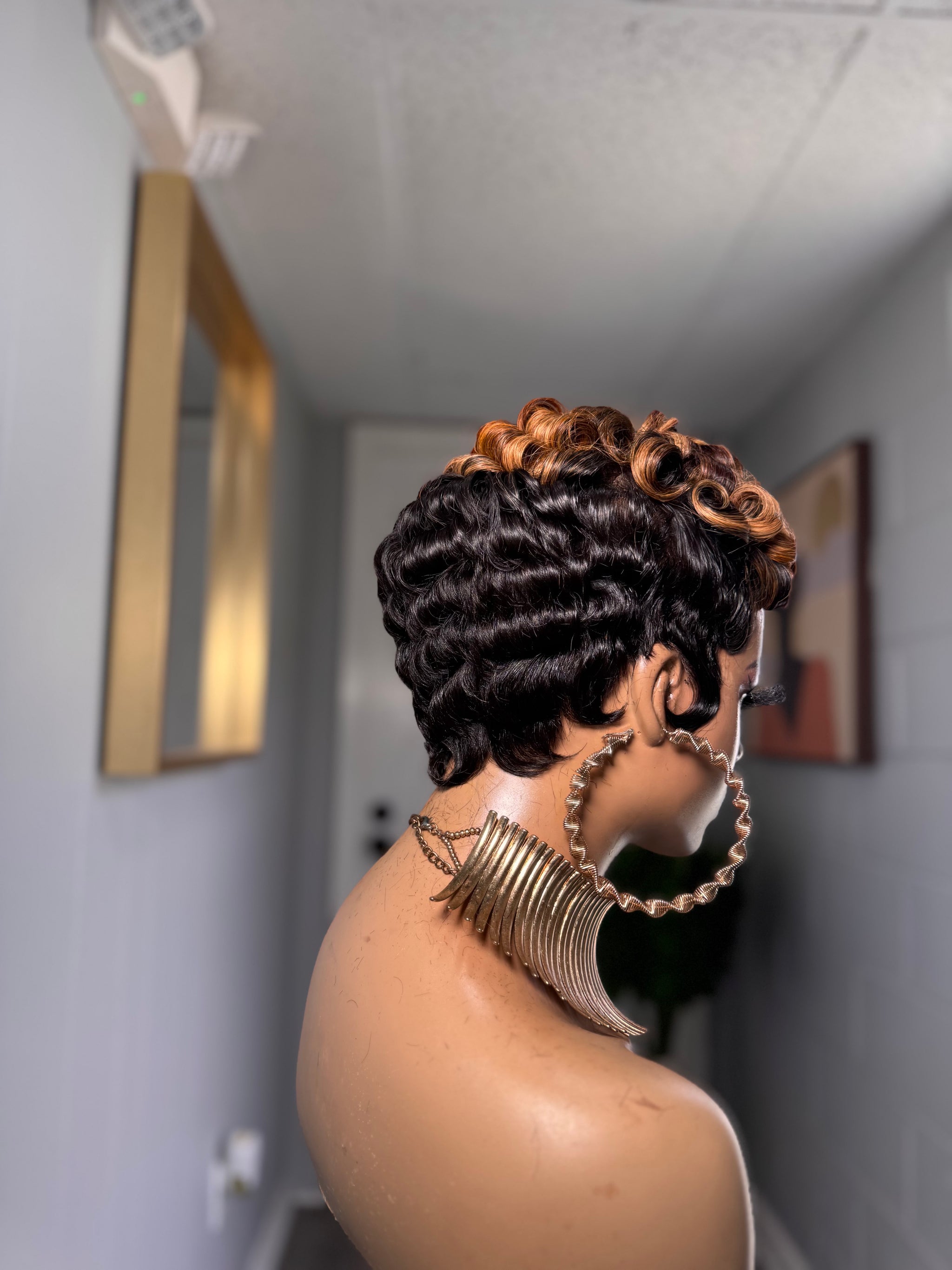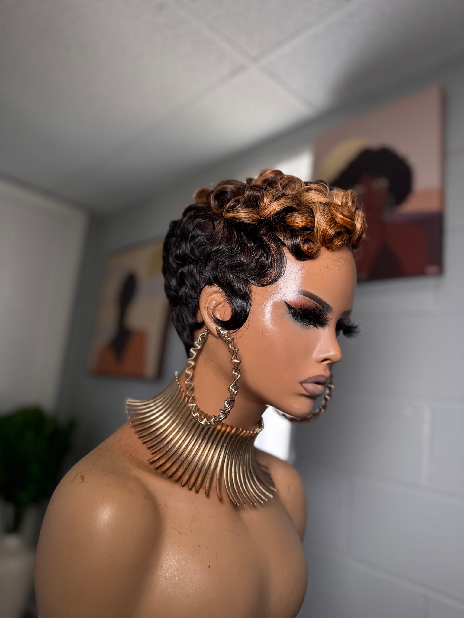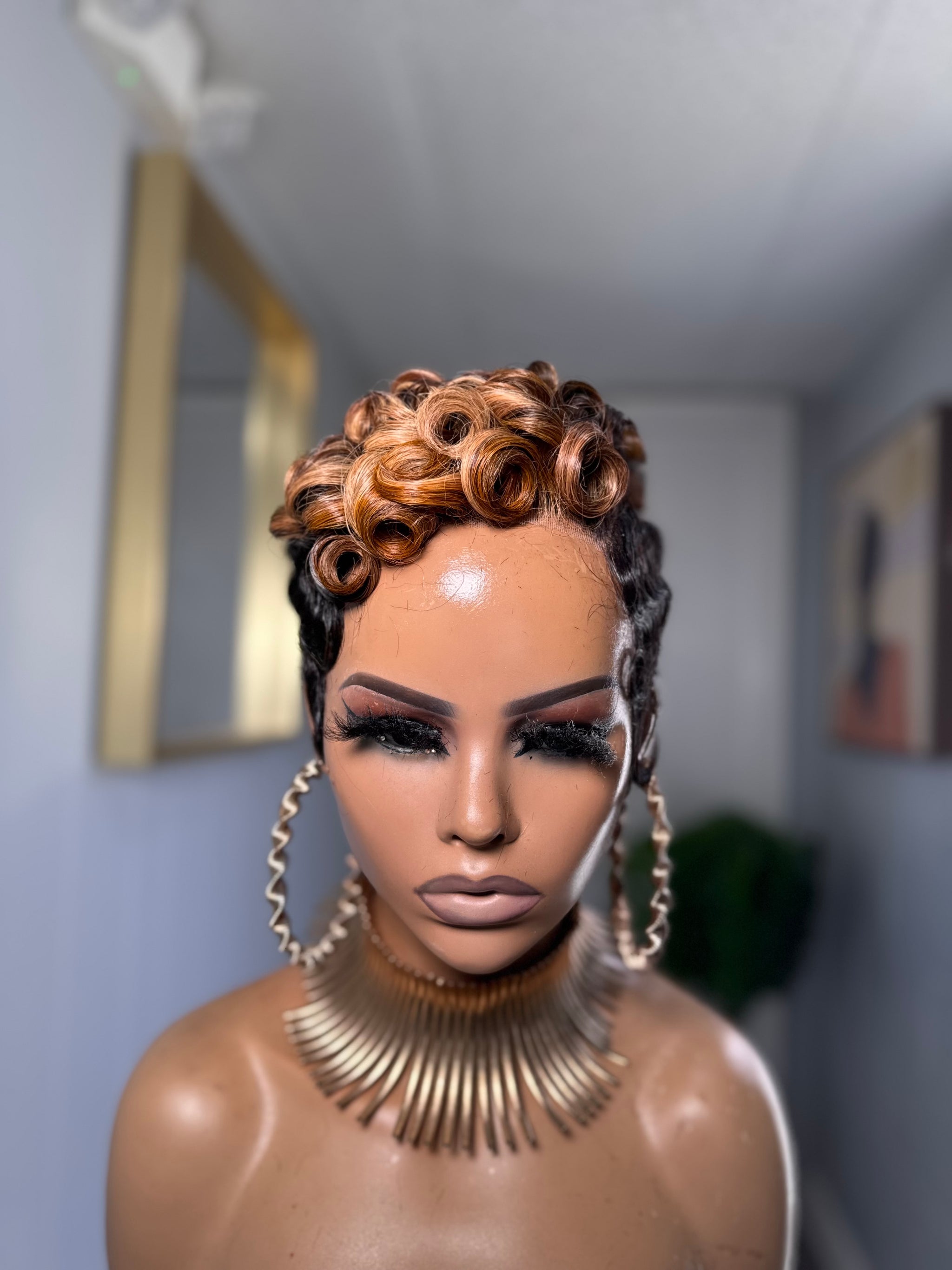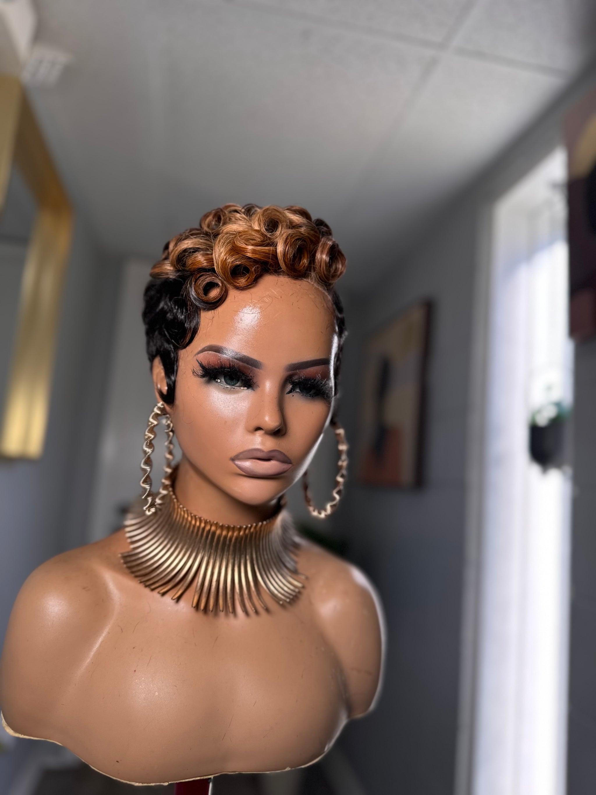 This pixie brings warm autumn energy with a beautiful four tone blend of coppers blondes and rich deep tones that melt together perfectly. The pin curl style gives soft texture and volume while still keeping that clean easy to wear pixie shape. It shares the same effortless feel as the Kendra unit but with added color dimension and movement.