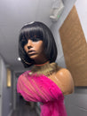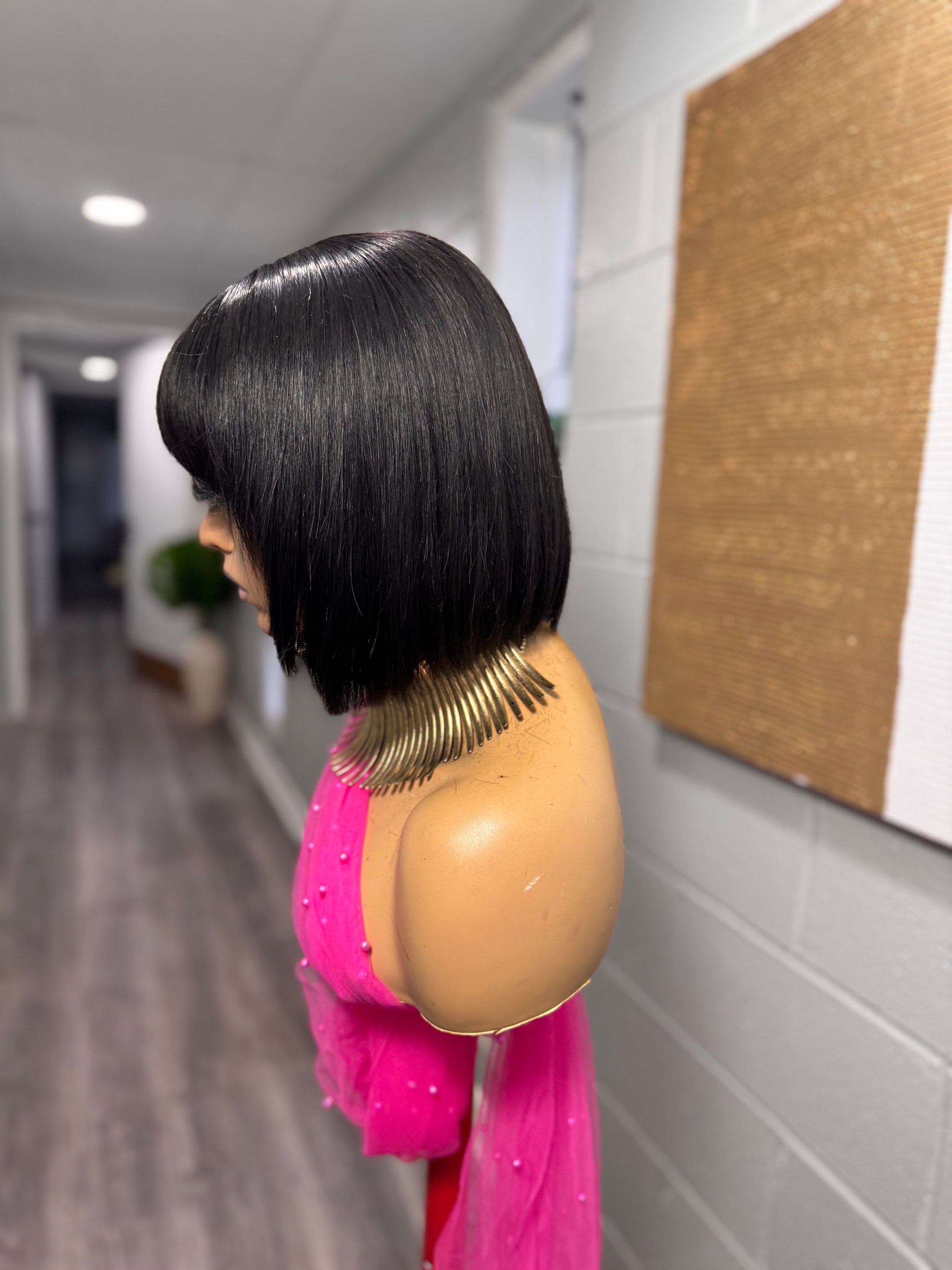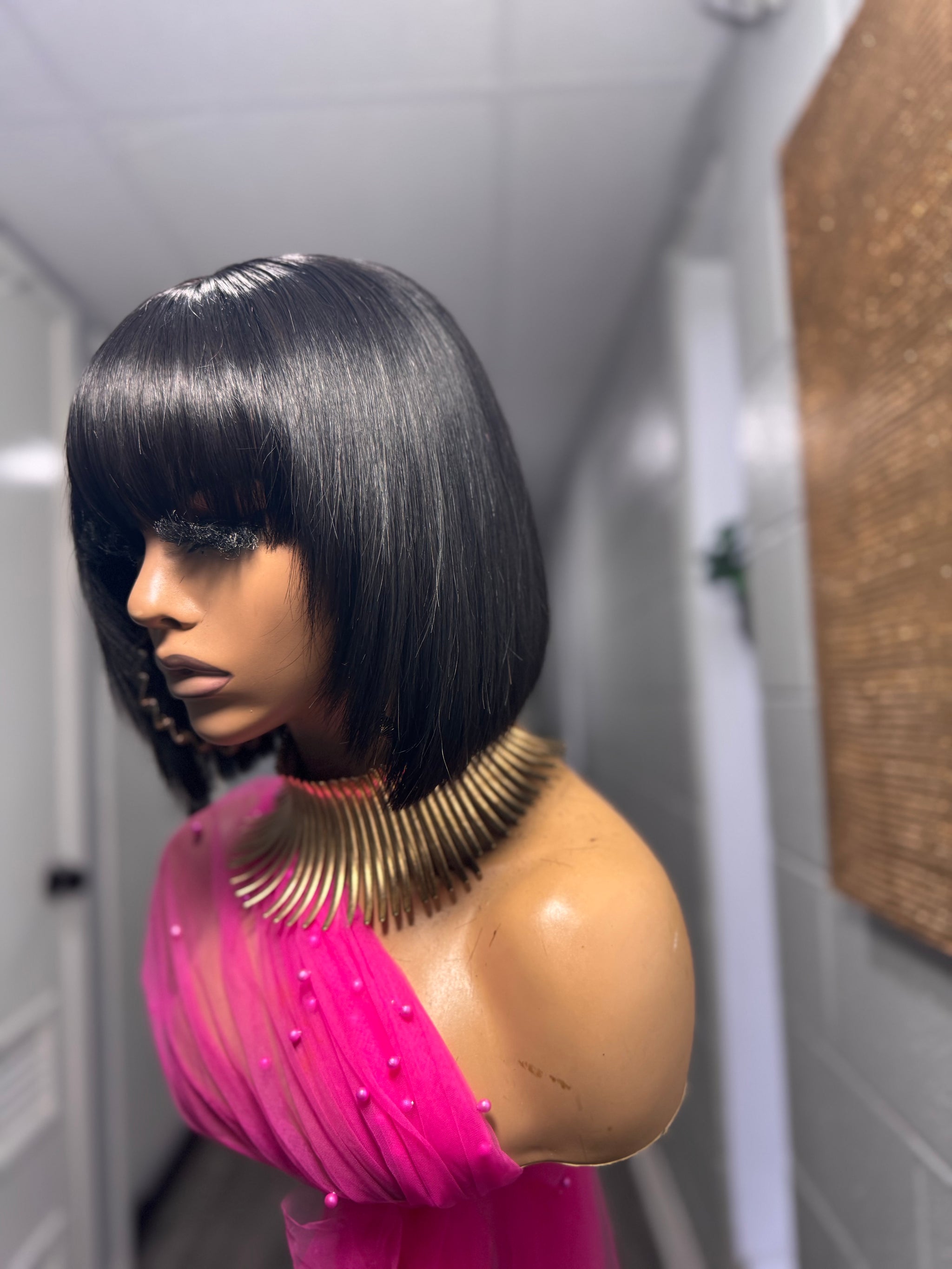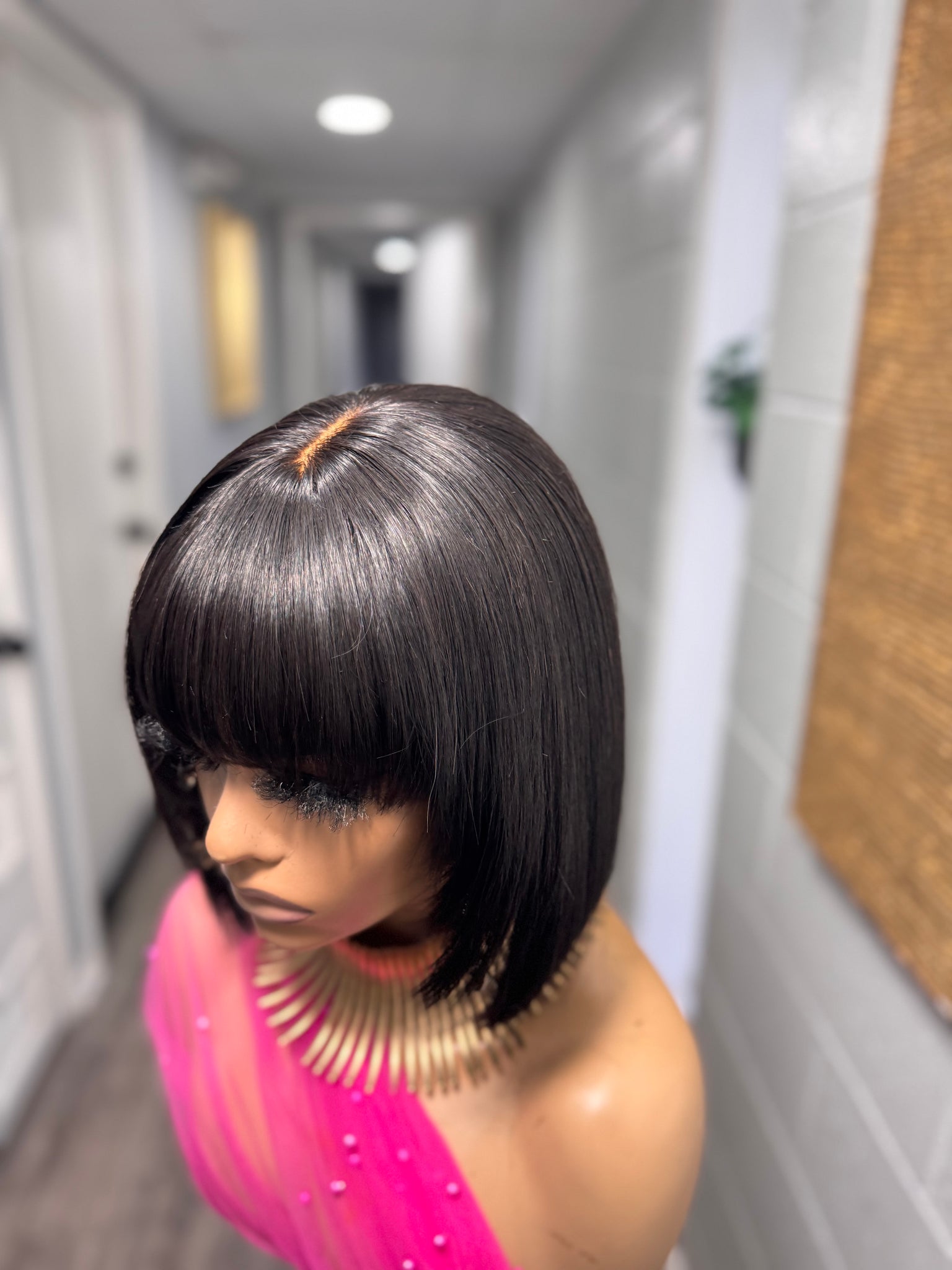 Crafted from 100% human Brazilian hair, this unit offers a soft, silky texture that can be straightened, curled, or bumped for a smooth salon finish. The precision blunt cut enhances your jawline and cheekbones, while the fringe adds a chic, effortless touch that flatters every face shape.