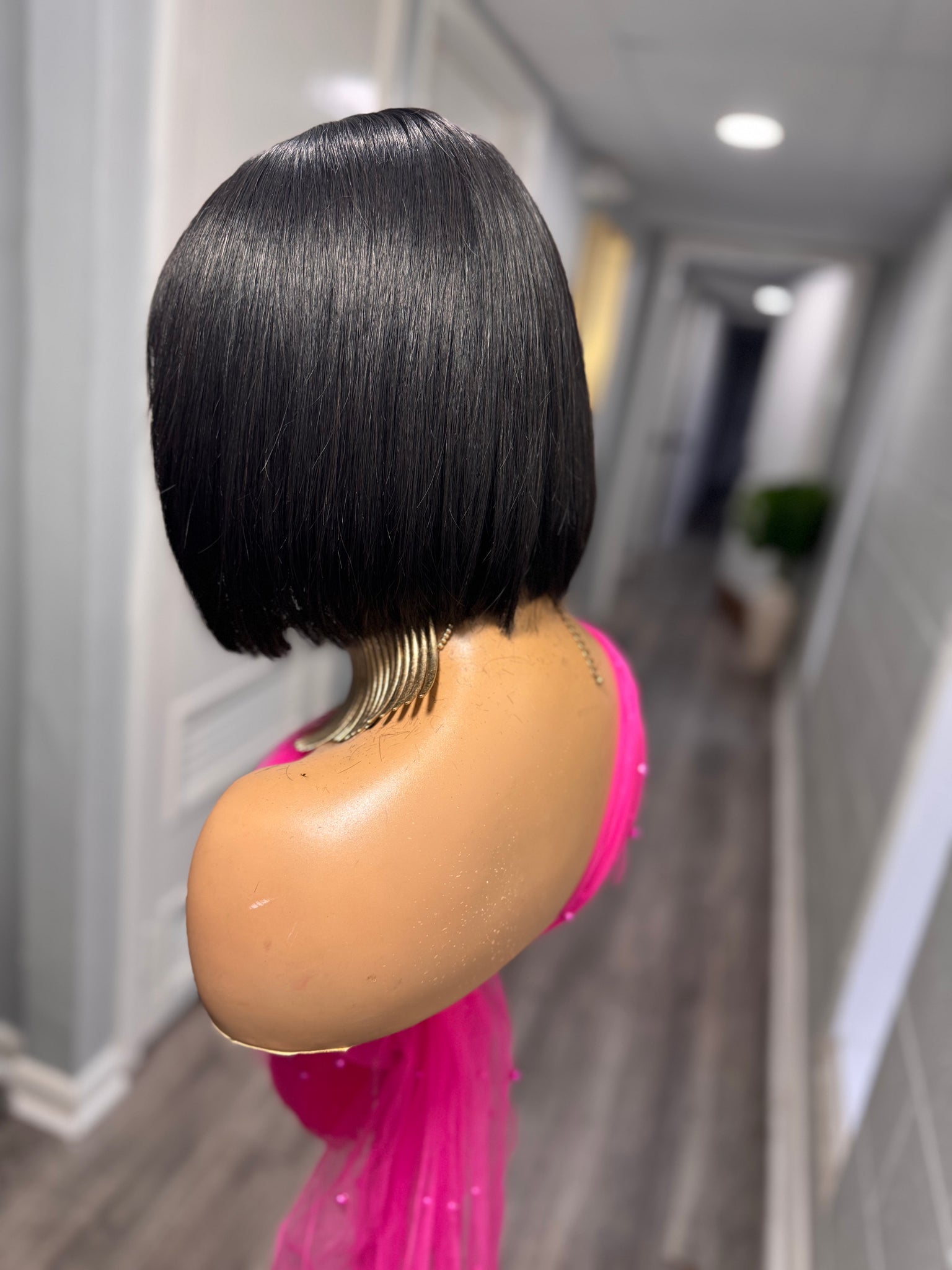 This sleek Brazilian Straight wig in natural 1B color features a customized blunt cut bob with a layered fringe in the front to beautifully frame your face. Designed for everyday elegance, the T-Part closure gives the appearance of a natural scalp while keeping installation quick and beginner-friendly.