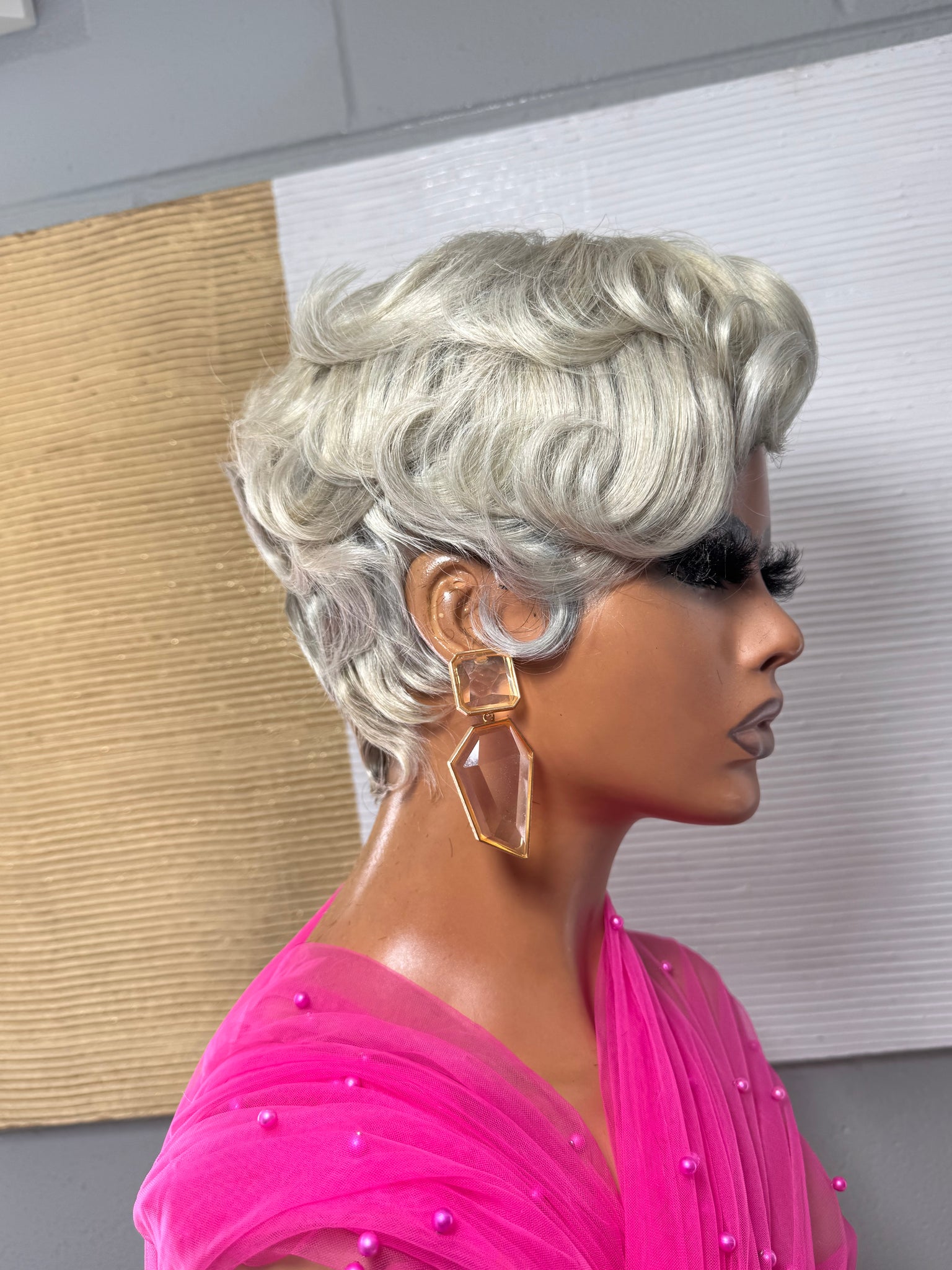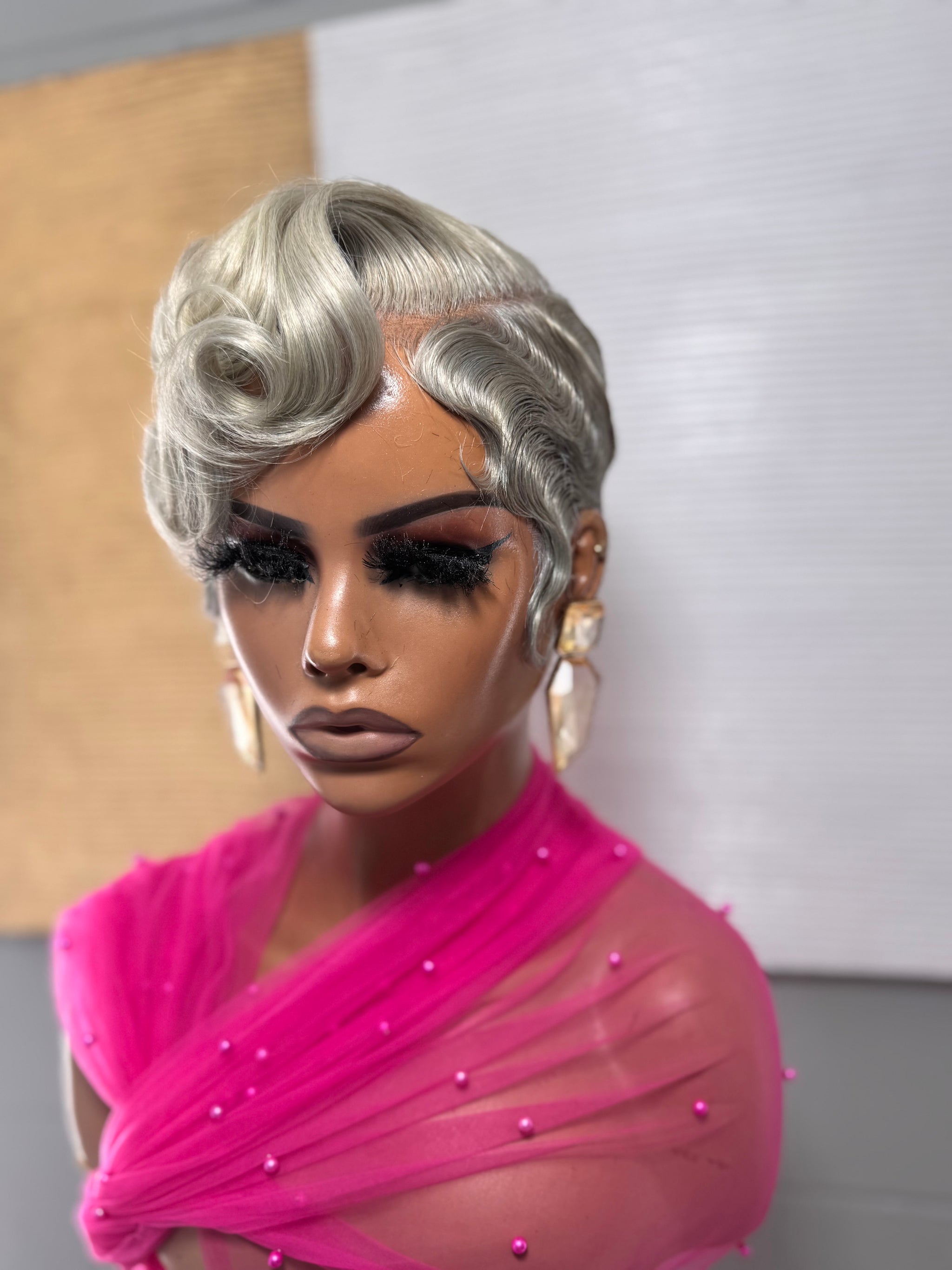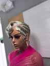 Turn heads with Frost Luxe, a full lace glueless pixie that lives in the icy platinum blonde family. This unit features sleek finger waves on the sides and a softly curled crown that falls a little longer for added movement and versatility.