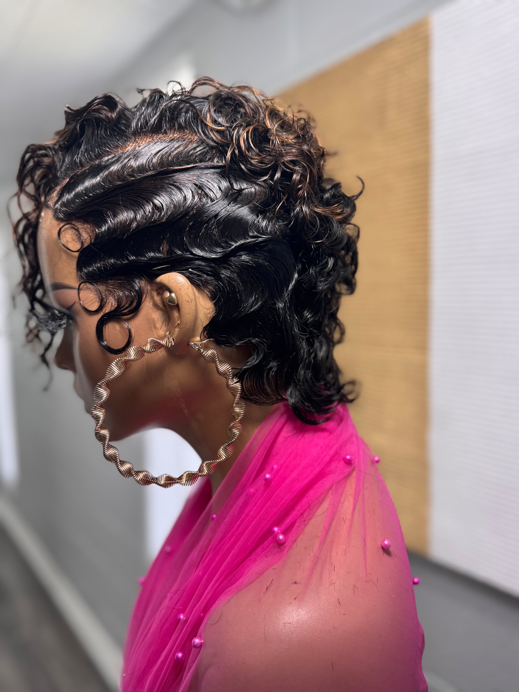 - Style: Spanish Curl, Short Length, with Slightly Longer Nape Detail