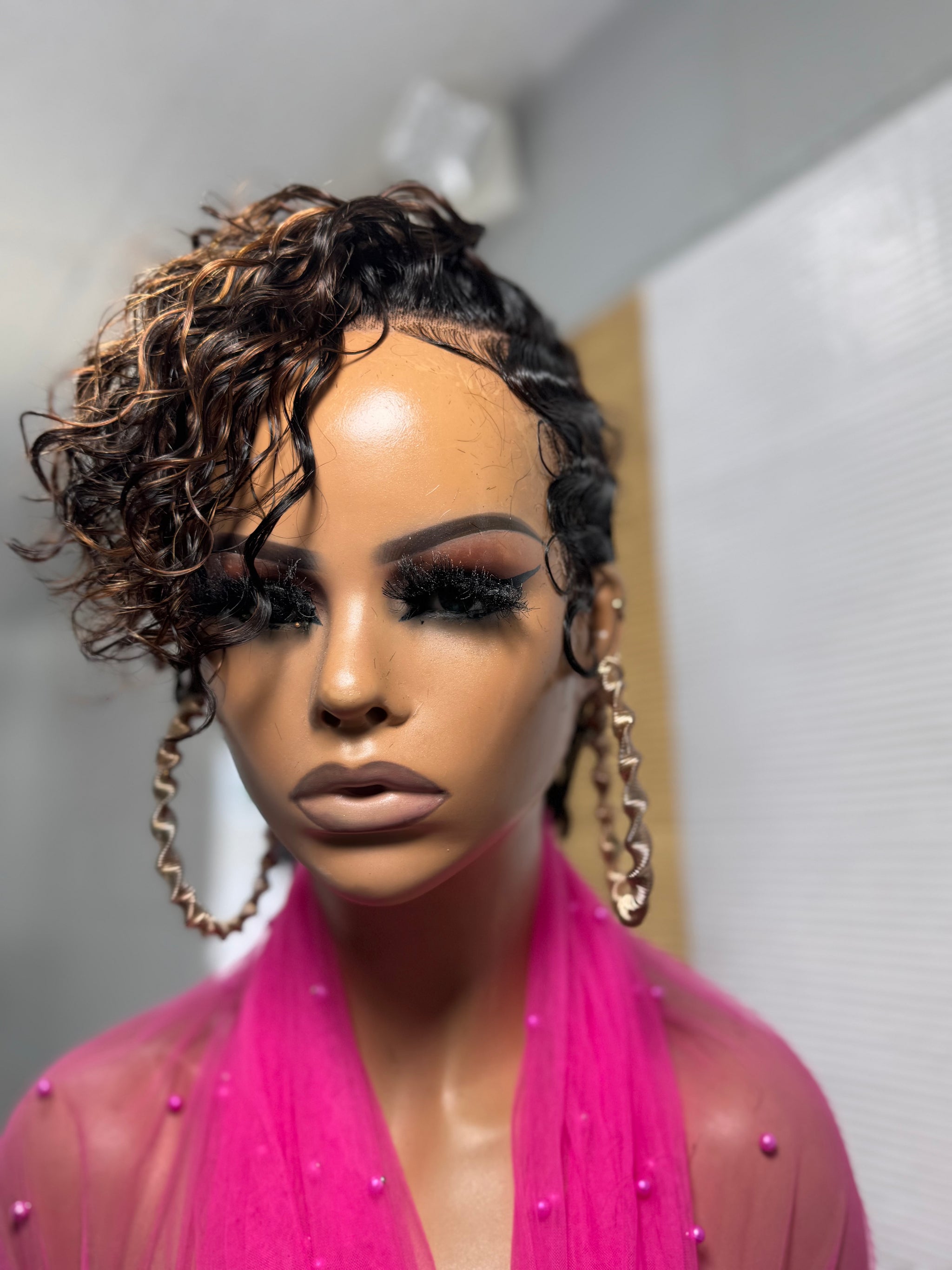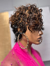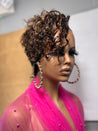 Shine in every light with our Golden Hour Full Lace Wig Pixie , featuring a rich 1B base kissed with honey brown and honey blonde highlights. This short, natural curl style is perfect for women who want effortless glamour with a touch of warmth and dimension. Designed with a slightly longer nape, this piece frames your face beautifully while keeping a sleek, modern silhouette.