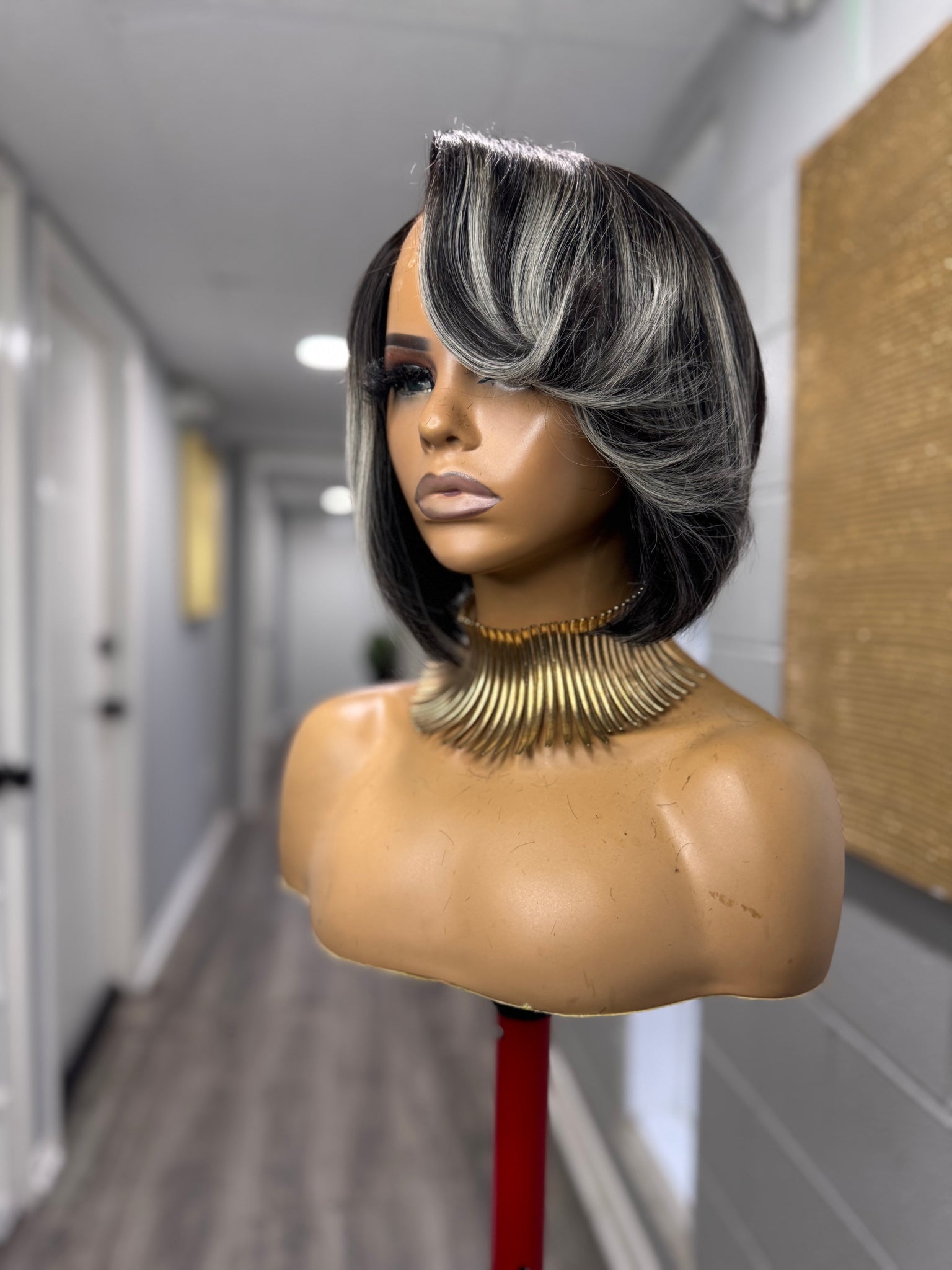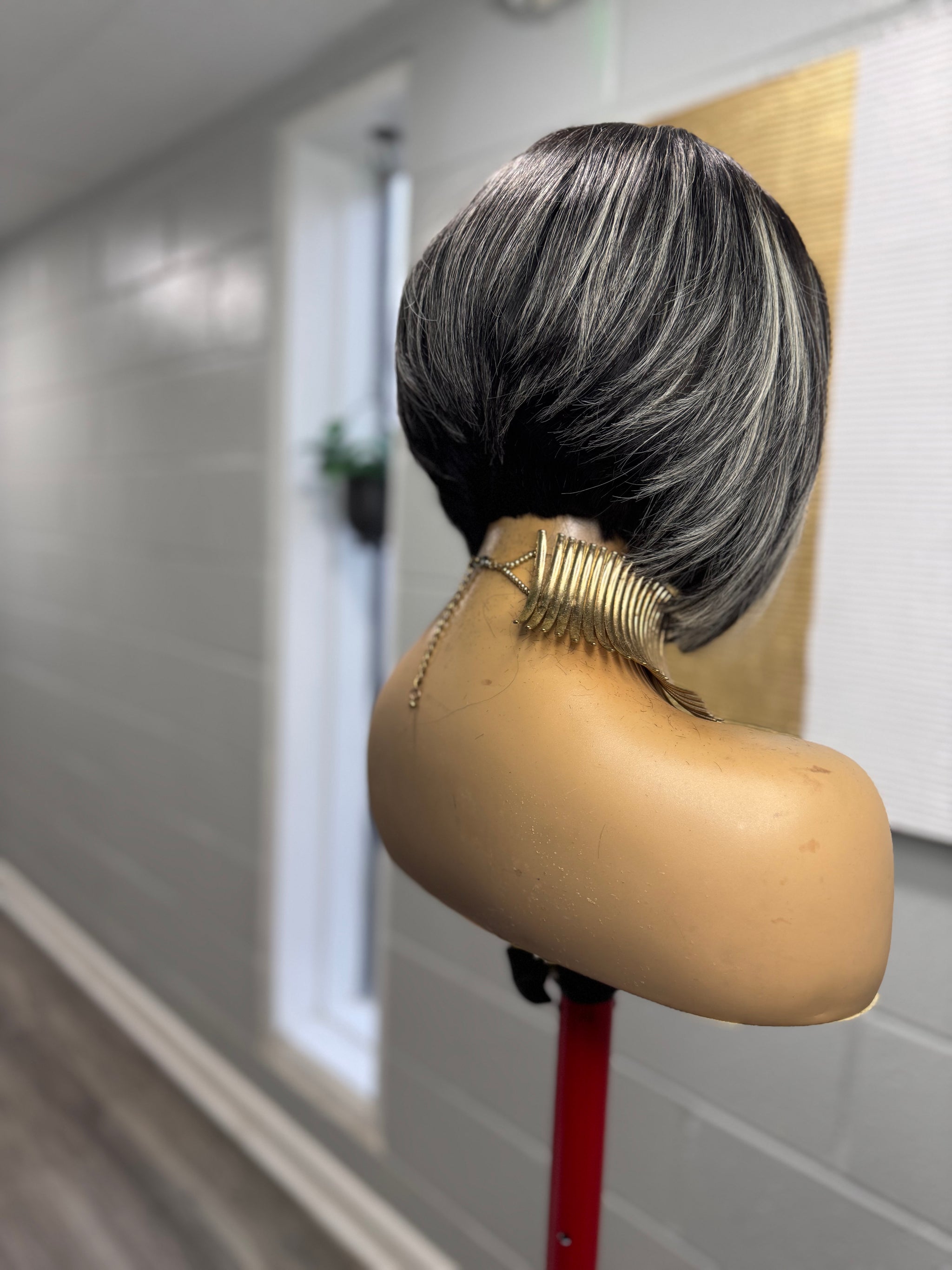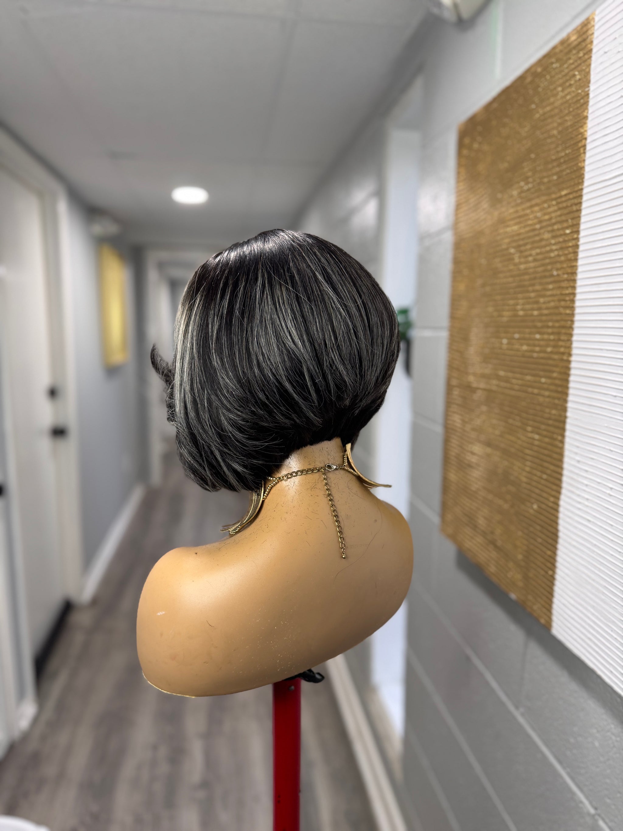 Silver Whisper Bob is that classy grown woman moment in wig form. This salt and pepper bob is short in the back, longer in the front and comes with a soft layered swoop bang that keeps it sleek without being heavy. It is made on a five by five closure so you can wear it completely glueless. Both bands are adjustable and the wig combs give it the perfect amount of security. If you love a clean layered bob without too much hair, this one is perfect.