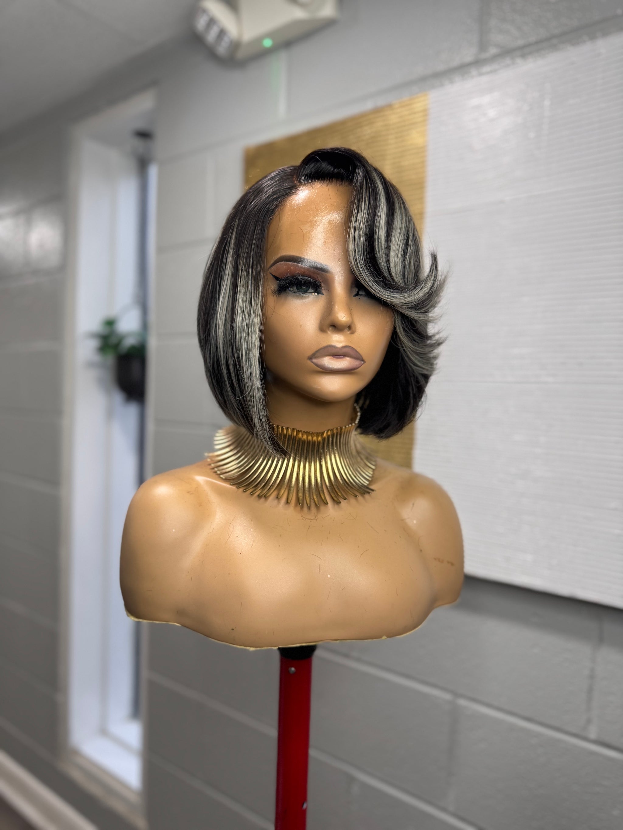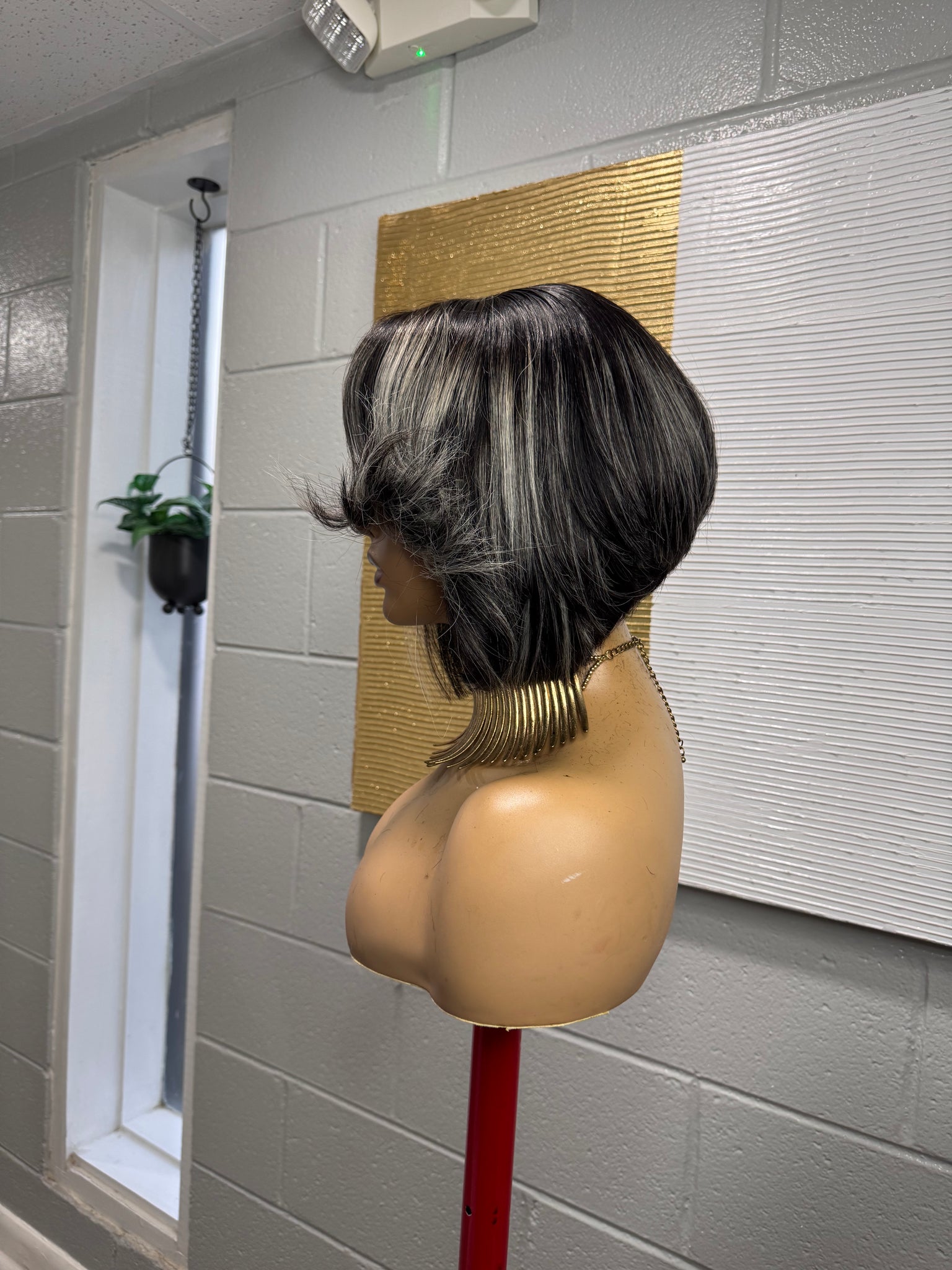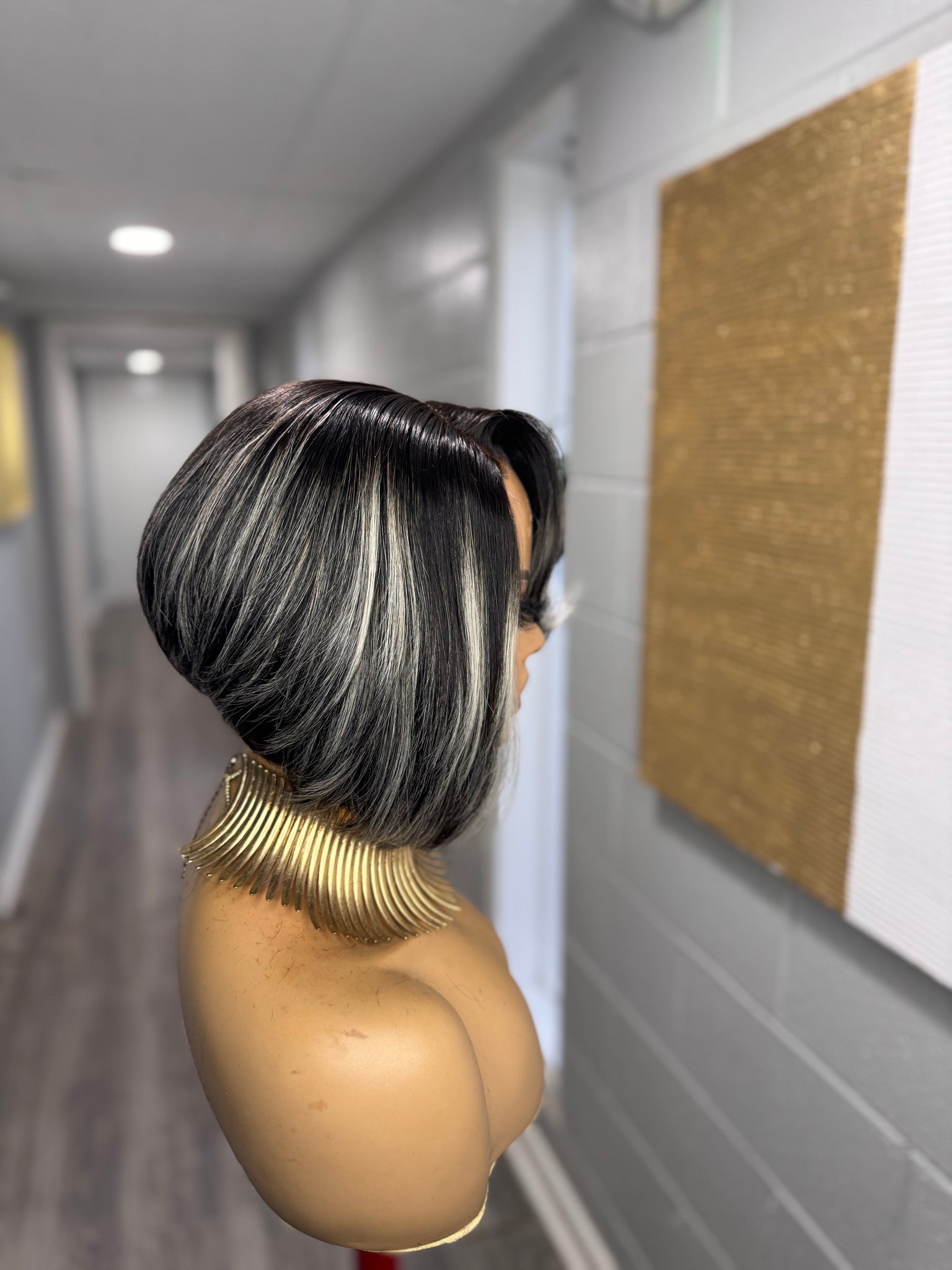 Silver Whisper Bob is that classy grown woman moment in wig form. This salt and pepper bob is short in the back, longer in the front and comes with a soft layered swoop bang that keeps it sleek without being heavy. It is made on a five by five closure so you can wear it completely glueless. Both bands are adjustable and the wig combs give it the perfect amount of security. If you love a clean layered bob without too much hair, this one is perfect.
