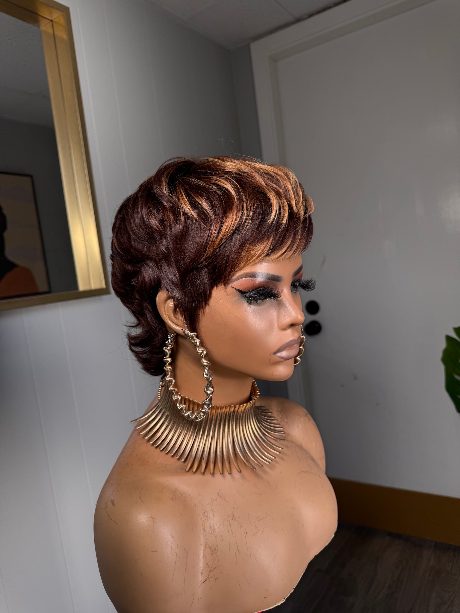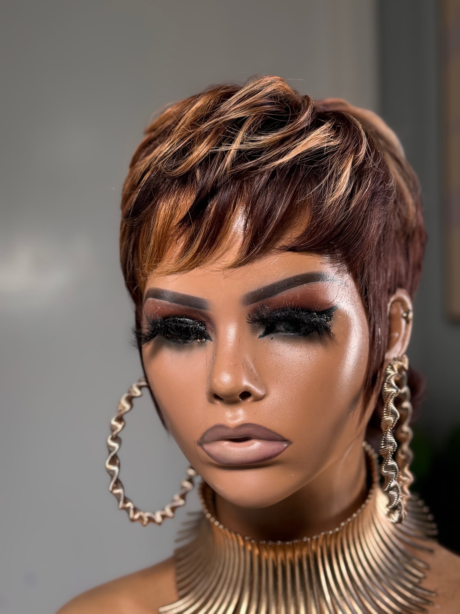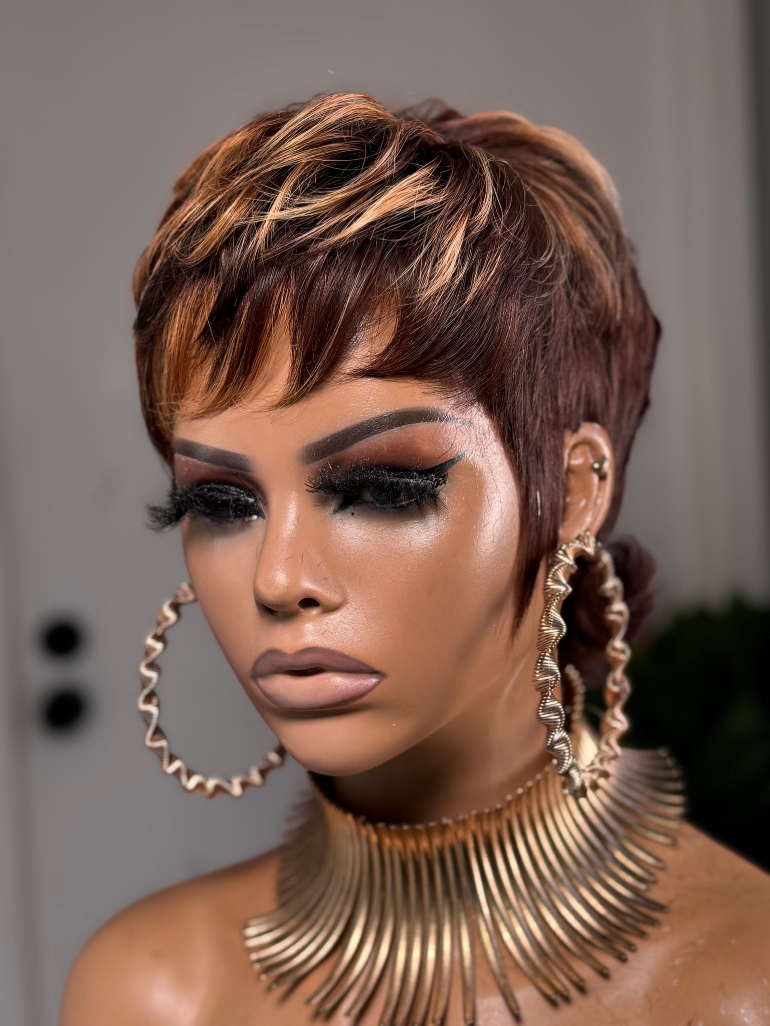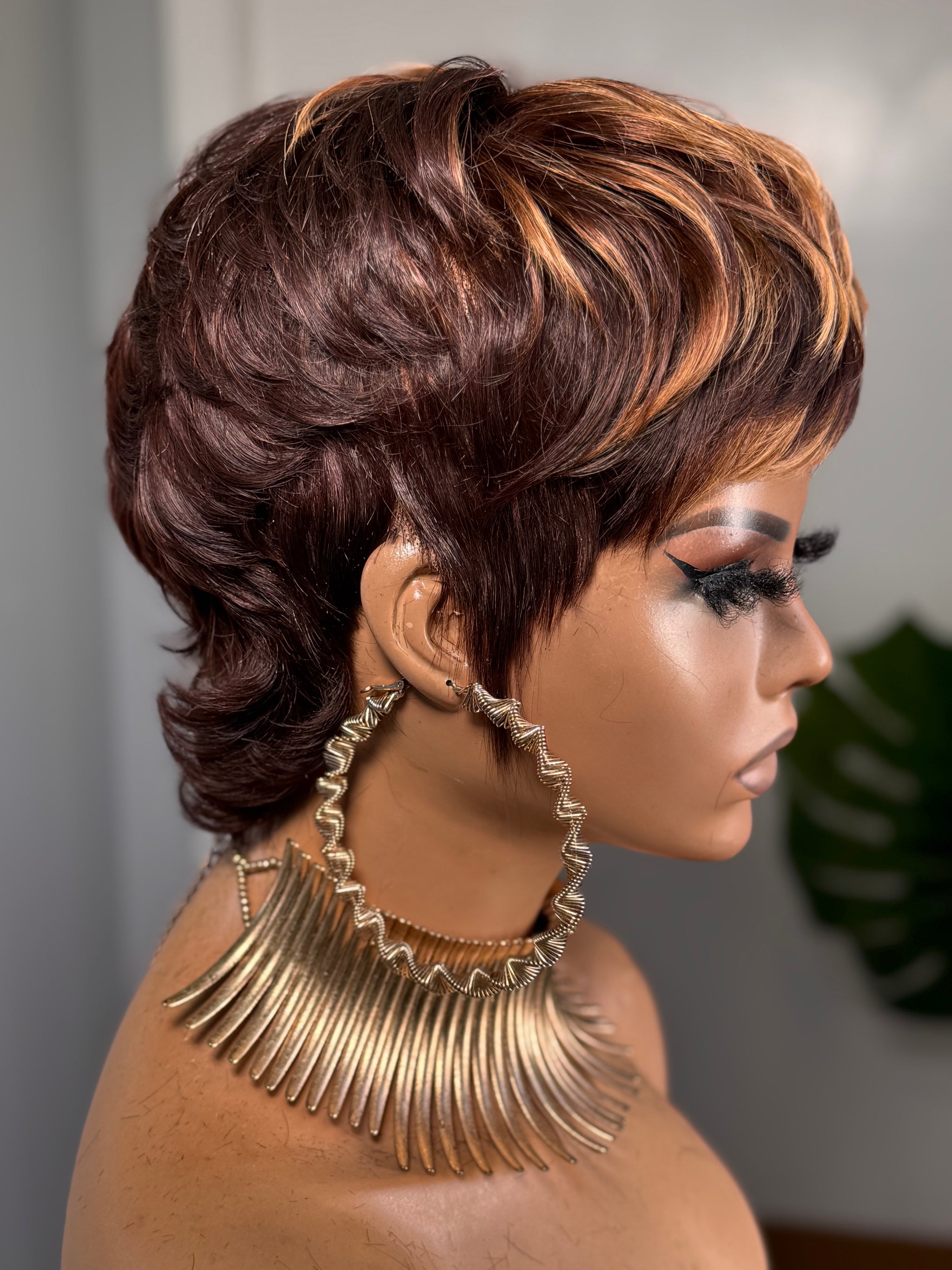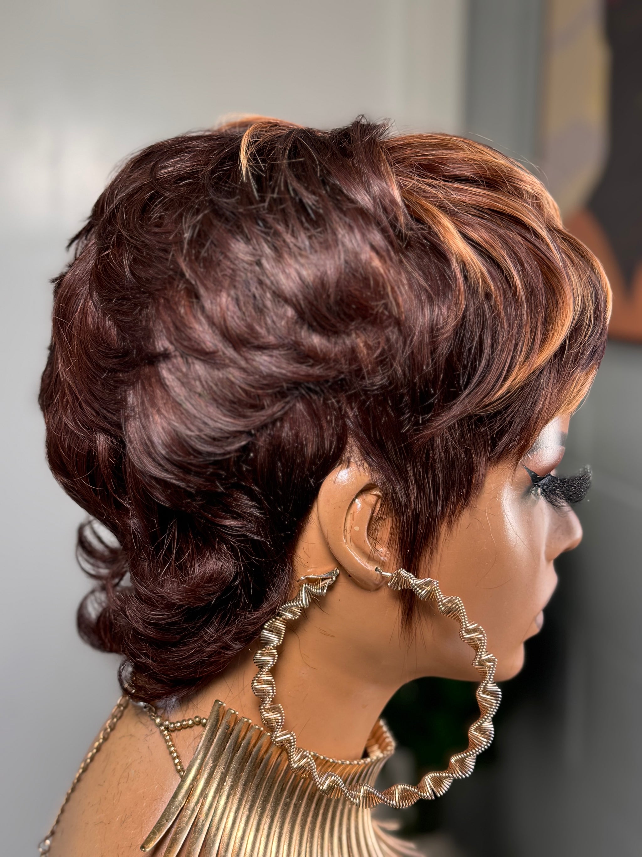 This shaggy wolf cut features a rich red brown base blended with soft highlights that add depth, movement, and texture throughout the unit. She is layered, lived in, and perfectly undone in the best way.